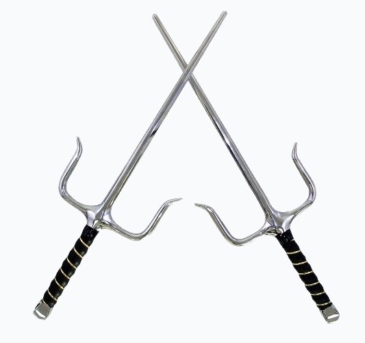 The sai is a weapon of Asian origin but preserved in its handling in Okinawan. It is believed that it was an agricultural tool that became a weapon, but it is also claimed that it evolved from the beginning as a weapon. Its basic form is that of a dagger without edge but with a sharp point, with two long side protections ('handguards' or tsuba in Japanese) also pointed, attached to the hilt. The sai are built in various ways, in some, the central point is round and smooth, while others are octagonal. The tsuba is traditionally symmetrical, with both ends pointing forward, however there are some variations of the Sai. In the Manji Sai design developed by Taira Shinken the points are opposite, that is, one point towards the front and the other towards the back.